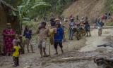 Sejumlah warga bergotong royong membuka akses jalan yang tertutup longsor akibat banjir bandang di Desa Arangani, Kabupaten Hulu Sungai Tengah, Kalimantan Selatan, Jumat (22/1/2021). Berdasarkan data terbaru dari Badan Penanggulangan Bencana Daerah (BPBD) Provinsi Kalimantan Selatan pada Jumat (22/1/2021) , sebanyak 148.031 KK dengan 505.557 jiwa terdampak bencana banjir di Kalimantan Selatan. (FOTO : ANTARA/Bayu Pratama S)