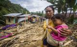 Warga menggendong anaknya berada di dekat puing-puing rumah dan batang pohon yang terbawa arus akibat banjir bandang di Desa Arangani, Kabupaten Hulu Sungai Tengah, Kalimantan Selatan, Jumat (22/1/2021). Berdasarkan data terakhir dari Badan Penanggulangan Bencana Daerah (BPBD) Provinsi Kalimantan Selatan pada Jumat (22/1/2021) , sebanyak 148.031 KK dengan 505.557 jiwa terdampak bencana banjir di Kalimantan Selatan. (FOTO : ANTARA/Bayu Pratama S)