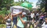 Keluarga dan kerabat mengangkat peti jenazah Angga Fernanda Afriyon untuk dimakamkan di Sungai Sapiah, Padang, Sumatera Barat, Sabtu (23/1/2021). Angga Fernanda Afriyon merupakan korban Pesawat Sriwijaya Air SJ-182 rute Jakarta-Pontianak yang berhasil diidentifikasi oleh Tim Disaster Victim Identification (DVI) Polri dan diserahkan kepada keluarga untuk dimakamkan di kampung halamannya di Padang. (FOTO : Antara/Iggoy el Fitra)