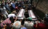 Pelayat memasukkan dua peti jenazah korban pesawat Sriwijaya Air SJ 182, Rahmania Ekananda dan Fatimah Asalim ke dalam liang lahat di Pare, Kediri, Jawa Timur, Sabtu (23/1/2021). Jenazah Rahmania Ekananda beserta anak ke duanya Fatimah Asalim teridentifikasi dan dimakamkan di Kediri, sementara anak pertamanya Fazila Amara belum ditemukan. (FOTO : Antara/Prasetia Fauzani)