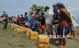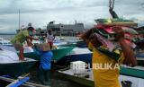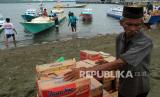 REPUBLIKA.CO.ID, MAMUJU -- Sejumlah nelayan memindahkan bantuan logistik di MakoLanal Mamuju, Sulawesi Barat, Senin (25/1). TNI AL menyalurkan bantuan logistik kepada nelayan pesisir yang terdampak gempa Sulawesi Barat.