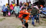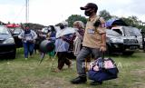 Relawan membantu pengungsi saat pulang dari Barak Pengungsian Glagaharjo, Sleman, Yogyakarta, Selasa (26/1). Selama 81 hari penduduk rentan dari Kalitengah Lor diharuskan mengungsi sejak kenaikan status Siaga Gunung Merapi. Mereka diperbolehkan pulang mengacu pada perubahan rekomendasi daerah bahaya Erupsi Gunung Merapi yang dikeluarkan oleh BPPTKG. (FOTO : Wihdan Hidayat / Republika)