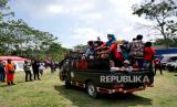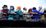 Pengungsi penduduk rentan pulang dari Barak Pengungsian Glagaharjo menggunakan mobil bak terbuka, Sleman, Yogyakarta, Selasa (26/1). Selama 81 hari penduduk rentan dari Kalitengah Lor diharuskan mengungsi sejak kenaikan status Siaga Gunung Merapi. Mereka diperbolehkan pulang mengacu pada perubahan rekomendasi daerah bahaya Erupsi Gunung Merapi yang dikeluarkan oleh BPPTKG. (FOTO : Wihdan Hidayat / Republika)