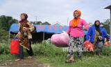 Pengungsi meninggalkan Barak Pengungsian Glagaharjo, Sleman, Yogyakarta, Selasa (26/1). Selama 81 hari penduduk rentan dari Kalitengah Lor diharuskan mengungsi sejak kenaikan status Siaga Gunung Merapi. Mereka diperbolehkan pulang mengacu pada perubahan rekomendasi daerah bahaya Erupsi Gunung Merapi yang dikeluarkan oleh BPPTKG. (FOTO : Wihdan Hidayat / Republika)