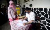 Petugas mendata warga yang hendak mengambil Bantuan Sosial Tunai (BST) di SMPN 3, Jakarta, Selasa (26/1). Pencairan bansos Bantuan Sosial Tunai (BST) di Provinsi DKI Jakarta dilakukan secara bertahap mulai Januari-April 2021. Pencairan bansos di Jakarta yang dilakukan Bank DKI bersama Dinsos DKI Jakarta dibatasi hanya untuk 500 orang penerima per titik per hari demi menghindari penyebaran pandemi COVID-19. (FOTO : Prayogi/Republika.)