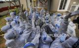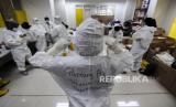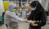 Tenaga kesehatan saat memakai alat pelindung diri sebelum bertugas di RSDC Wisma Atlet, Jakarta, Selasa (26/1). (FOTO : Republika/Putra M. Akbar)