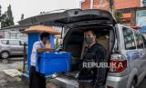 Petugas kesehatan membawa kotak pendingin berisi vaksin Covid-19 Sinovac saat didistribusikan di Instalasi Farmasi Dinas Kesehatan Kota Bandung, Jalan Supratman, Kota Bandung, Rabu (27/1). Dinas Kesehatan Kota Bandung mendistribusikan 25.040 dosis vaksin Covid-19 Sinovac ke 191 fasilitas kesehatan di Kota Bandung untuk pelaksanaan penyuntikan tahap kedua bagi sumber daya manusia (SDM) di lingkungan kesehatan, kepala daerah serta tokoh publik pada (28/1) mendatang. (FOTO : ABDAN SYAKURA/REPUBLIKA)