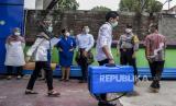 Petugas kesehatan mengantre untuk mendapatkan vaksin Covid-19 Sinovac saat didistribusikan di Instalasi Farmasi Dinas Kesehatan Kota Bandung, Jalan Supratman, Kota Bandung, Rabu (27/1). Dinas Kesehatan Kota Bandung mendistribusikan 25.040 dosis vaksin Covid-19 Sinovac ke 191 fasilitas kesehatan di Kota Bandung untuk pelaksanaan penyuntikan tahap kedua bagi sumber daya manusia (SDM) di lingkungan kesehatan, kepala daerah serta tokoh publik pada (28/1) mendatang. (FOTO : ABDAN SYAKURA/REPUBLIKA)