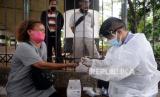 Warga melihat hasil pemeriksaan rapid test antibodi yang dilakukan oleh Tim Pemburu Covid-19 Polrestro Jaktim di Kawasan Terminal Kampung Melayu, Jakarta, Rabu (27/1). Selain melakukan rapid test antibodi kepada warga, Tim Pemburu Covid-19 Polrestro Jaktim tersebut juga membagikan masker hal ini sebagai upaya menekan angka penyebaran Covid-19. (FOTO : Prayogi/Republika.)