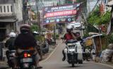 Pengendara sepeda motor melintas didekat spanduk peringatan Zona Merah di RW 010, Kelurahan Cipinang Melayu, Jakarta, Rabu (27/1). Pemerintah Provinsi DKI Jakarta mencatat terdapat 54 rukun warga (RW) menjadi zona merah Covid-19 per 21 Januari 2021. Pemerintah daerah menyebutnya sebagai RW zona rawan yang berarti tingkat risiko penularan virus corona tinggi. (FOTO : Prayogi/Republika.)