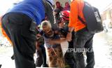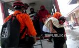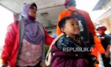 Warga Turgo dibantu petugas turun dari truk angkutan di Barak Pengungsian Purwobinangun, Sleman, Yogyakarta, Rabu (27/1). (FOTO : Wihdan Hidayat / Republika)
