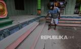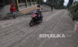 Warga melintasi jalan desa yang tertutup abu vulkanik Gunung Merapi di Beling, Sangup, Tamansari, Boyolali, Jawa Tengah, Rabu (27/1). (FOTO : Antara/Aloysius Jarot Nugroho)