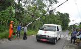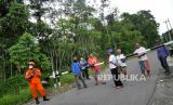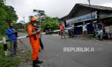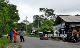 Warga bersama BPBD Sleman menjaga portal jalan naik menuju Turgo di Dusun Ngepring, Sleman, Yogyakarta, Rabu (27/1).  (FOTO : Wihdan Hidayat / Republika)
