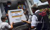 Petugas mengangkut alat perlengkapan vaksin yang akan didistribusikan ke kabupaten, di Gudang Vaksin Dinas Kesehatan Provinsi Sumatra Selatan Palembang, Sumsel, Rabu (27/1). Provinsi Sumsel menerima jatah vaksin tahap II sebanyak 38.000 dosis yang didistribusikan ke kabupaten dan Kota di Sumsel. (FOTO : ANTARA/Feny Selly)