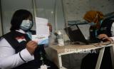 Petugas memeriksa kondisi fisik tenaga kesehatan sebelum disuntikan vaksin COVID-19 ke seorang tenaga kesehatan di Puskesmas Tanah Sareal, Bogor, Jawa Barat, Kamis (28/1). Sejumlah para tenaga kesehatan menjalani suntik vaksinasi Covid-19 tahap kedua yang mulai dilaksanakan pada pada hari ini Kamis (28/1).Prayogi/Republika (FOTO : Prayogi/Republika.)