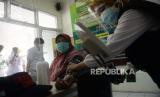 Petugas menyuntikan vaksin COVID-19 ke seorang tenaga kesehatan di Puskesmas Tanah Sareal, Bogor, Jawa Barat, Kamis (28/1).Sejumlah para tenaga kesehatan menjalani suntik vaksinasi Covid-19 tahap kedua yang mulai dilaksanakan pada pada hari ini Kamis (28/1). (FOTO : Prayogi/Republika.)