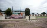 Petugas Satpol PP berjaga di kawasan Stadion Pakansari, Kabupaten Bogor, Jawa Barat, yang ditutup sementara, Kamis (28/1). Pemerintah Kabupaten Bogor menutup sementara kawasan Stadion Pakansari dari segala aktivitas selama Pemberlakuan Pembatasan Kegiatan Masyarakat (PPKM) hal untuk menghindari kerumunan yang berpotensi menyebarkan Covid-19. (FOTO : Prayogi/Republika.)