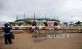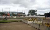 Petugas Satpol PP berjaga di kawasan Stadion Pakansari, Kabupaten Bogor, Jawa Barat, yang ditutup sementara, Kamis (28/1). Pemerintah Kabupaten Bogor menutup sementara kawasan Stadion Pakansari dari segala aktivitas selama Pemberlakuan Pembatasan Kegiatan Masyarakat (PPKM) hal untuk menghindari kerumunan yang berpotensi menyebarkan Covid-19.Prayogi/Republika (FOTO : Prayogi/Republika.)