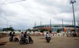 Warga dengan menggunakan motor meninggalkan kawasan Stadion Pakansari, Kabupaten Bogor, Jawa Barat, Kamis (28/1). Pemerintah Kabupaten Bogor menutup sementara kawasan Stadion Pakansari dari segala aktivitas selama Pemberlakuan Pembatasan Kegiatan Masyarakat (PPKM) hal untuk menghindari kerumunan yang berpotensi menyebarkan Covid-19. (FOTO : Prayogi/Republika.)