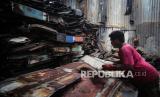 Pekerja membawa potongan bagian rangka bus Kopaja di Meruya, Jakarta, Kamis (28/1). Bus Kopaja yang sudah tidak terpakai tersebut dihancurkan untuk dijual secara kiloan ke penjual besi tua. (FOTO : Antara/Fauzan)