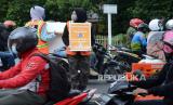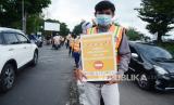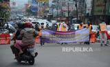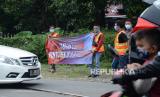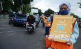 Aktivitas para relawan perlintasan di pintu perlintasan kereta api Jalan Ahmad Yani, Kota Bandung, Jumat (29/1). Selain mengedukasi para pengguna jalan agar tertib berlalu lintas dan tidak menerobos pintu lintasan kereta api, mereka juga mengingatkan pengguna jalan agar menerapkan protokol kesehatan pencegahan Covid-19. (FOTO : Edi Yusuf/Republika)