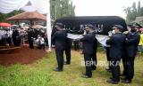 Para rekan kerja mengusung peti jenazah Pilot Sriwijaya Air SJ 182 Kapten Afwan saat prosesi pemakaman di TPU Pondok Rajeg, Kabupaten Bogor, Jawa Barat, Sabtu (30/1). Tim Disaster Victim Identification (DVI) Polri berhasil mengidentifikasi Pilot Sriwijaya Air SJ 182 yakni Kapten Afwan, Selain itu tim DVI juga mengidentifikasi dua korban lainnya atas nama Suyanto dan Riyanto. Dengan demikian, sudah ada 58 jenazah dari total 62 korban yang berhasil diketahui identitasnya.Prayogi/Republika. (FOTO : Prayogi/Republika.)