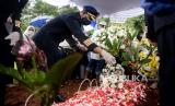 Rekan kerja menaburkan bunga ke atas makam Pilot Sriwijaya Air SJ 182 Kapten Afwan usai dimakamkan di TPU Pondok Rajeg, Kabupaten Bogor, Jawa Barat, Sabtu (30/1). Tim Disaster Victim Identification (DVI) Polri berhasil mengidentifikasi Pilot Sriwijaya Air SJ 182 yakni Kapten Afwan, Selain itu tim DVI juga mengidentifikasi dua korban lainnya atas nama Suyanto dan Riyanto. Dengan demikian, sudah ada 58 jenazah dari total 62 korban yang berhasil diketahui identitasnya.Prayogi/Republika. (FOTO : Prayogi/Republika.)