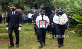 Para rekan kerja memberikan penghormatan kepada jenazah Pilot Sriwijaya Air SJ 182 Kapten Afwan usai dimakamkan di TPU Pondok Rajeg, Kabupaten Bogor, Jawa Barat, Sabtu (30/1). Tim Disaster Victim Identification (DVI) Polri berhasil mengidentifikasi Pilot Sriwijaya Air SJ 182 yakni Kapten Afwan, Selain itu tim DVI juga mengidentifikasi dua korban lainnya atas nama Suyanto dan Riyanto. Dengan demikian, sudah ada 58 jenazah dari total 62 korban yang berhasil diketahui identitasnya.Prayogi/Republika. (FOTO : Prayogi/Republika.)