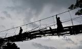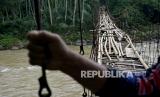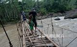 REPUBLIKA.CO.ID, GARUT -- Warga memegang kawat penyanggah saat melintasi jembatan rawayan yang rusak di Desa Simpang, Cibalong, Kabupaten Garut, Jawa Barat, Ahad (31/1). Jembatan penghubung antara Kabupaten Garut dan Kabupaten Tasikmalaya tersebut rusak akibat faktor usia sehingga menghambat aktivitas warga untuk akses mendapatkan fasilitas kesehatan, pendidikan, dan menjual hasil bumi.