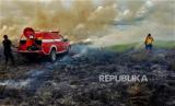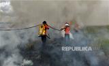 Personel Manggala Aqni Daerah Operasi Sulawesi Tenggara berusaha memadamkan api yang membakar lahan di Taman Nasional Rawa Aopa Watumohai, Kabupaten Bombana, Sulawesi Tenggara, Ahad (31/1). (FOTO : ANTARA FOTO)