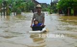 Warga membawa anaknya menggunkan ember melintasi jalan yang terendam banjir di Desa Kedungdowo, Kudus, Jawa Tengah, Selasa (2/2) Banjir yang sudah berlangsung tiga hari akibat meluapnya sungai Wulan ditambah tingginya intensitas hujan itu meluas dan merendam ribuan rumah dan fasilitas umum di 10 desa di kecamatan Kaliwungu, Jati dan Undaan dengan ketinggian hingga satu meter, sementara sebagian warga mengungsi ke tempat yang lebih aman.  (FOTO : Antara/Yusuf Nugroho)