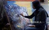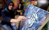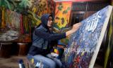 Pelukis Denok Retno Endah menyelesaikan lukisan dengan memanfaatkan serbuk kayu, Depok, Jawa Barat, Selasa (2/2). (FOTO : Prayogi/Republika)