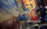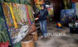 Pelukis Denok Retno Endah menata hasil lukisannya yang dibuat dengan memanfaatkan serbuk kayu, Depok, Jawa Barat, Selasa (2/2). (FOTO : Prayogi/Republika)