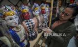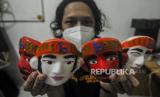 Pekerja memperlihatkan topeng miniatur ondel-ondel di Betawi Online Galeri, Setu Babakan, Jakarta, Selasa (2/2). (FOTO : Republika/Putra M. Akbar)