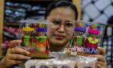 Pekerja menunjukan miniatur ondel-ondel di Betawi Online Galeri, Setu Babakan, Jakarta, Selasa (2/2). (FOTO : Republika/Putra M. Akbar)