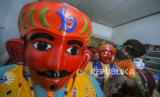 Pekerja menata miniatur ondel-ondel di Betawi Online Galeri, Setu Babakan, Jakarta, Selasa (2/2). (FOTO : Republika/Putra M. Akbar)