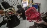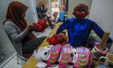 Pekerja menyelesaikan pembuatan miniatur ondel-ondel di Betawi Online Galeri, Setu Babakan, Jakarta, Selasa (2/2). (FOTO : Republika/Putra M. Akbar)