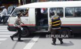 Petugas kopolisian memeriksa penumpang kendaraan angkutan umum saat kegiatan penegakan disiplin penerapan protokol kesehatan pencegahan Covid-19 di kawasan Alun-alun Lembang, Kabupaten Bandung Barat, Selasa (2/1). Petugas gabungan di antaranya dari kepolisian, TNI dan Satpol PP mengingatkan kepada pengguna jalan dan masyarakat agar menerapkan protokol kesehatan dengan baik. Petugas juga membagikan masker kepada warga yang tidak memakai masker. (FOTO : Edi Yusuf/Republika)