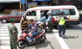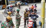 Petugas gabungan di antaranya dari kepolisian, TNI dan Satpol PP terus melakukan sosialisai penerapan protokol kesehatan kepada masyarakat untuk menekan penularan wabah Covid-19.
