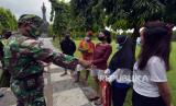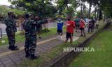 Anggota TNI AD menegur warga saat penutupan ruang publik di Lapangan Puputan Margarana Renon, Denpasar, Bali, Selasa (2/2/2021). Kegiatan tersebut untuk menertibkan warga agar tidak beraktivitas di ruang publik yang ditutup sementara selama Pemberlakuan Pembatasan Kegiatan Masyarakat (PPKM) untuk mencegah kerumunan dan menekan penyebaran COVID-19. (FOTO : Nyoman Hendra Wibowo/ANTARA FOTO)