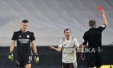 Pemain Arsenal David Luis mendapat kartu merah setelah melakukan pelanggaran terhadap pemain Wolves dalam pertandingan lanjutan Liga Inggris di Stadion Molineux, Rabu (3/2) dini hari WIB. (FOTO : EPA)