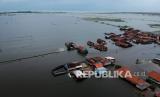 Foto udara limpasan air sungai menuju rumah warga di Pekalongan, Jawa Tengah, Kamis (4/2). (FOTO : Antara/Harviyan Perdana Putra)