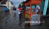 Warga membeli bakso di depan rumahnya yang tergenang banjir di Pekalongan, Jawa Tengah, Kamis (4/2).  (FOTO : Antara/Harviyan Perdana Putra)