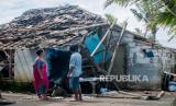 REPUBLIKA.CO.ID, PANDEGLANG -- Warga berada di dalam rumah yang rusak akibat angin puting beliung di Desa Sidamukti, Pandeglang, Banten, Kamis (4/2/2021).