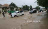 Kendaraan melintasi banjir di Jalan nasional Surabaya-Madiun, Desa Gondangmanis, Kecamatan Bandar Kedungmulyo, Kabupaten Jombang, Jawa Timur, Kamis (4/2/2021). Banjir yang disebabkan meluapnya Sungai avur Brawijaya di desa setempat mengakibatkan kemacetan sepanjang satu kilometer dan menggenangi puluhan rumah. (FOTO : SYAIFUL ARIF/ANTARA )
