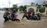 Warga membantu pengendara motor saat melintasi banjir di Jalan Nasional Surabaya-Madiun, Desa Gondangmanis, Kecamatan Bandar Kedungmulyo Kabupaten Jombang, Jawa Timur, Kamis (4/2/2021). Banjir yang disebabkan meluapnya Sungai avur Brawijaya di desa setempat mengakibatkan kemacetan sepanjang satu kilometer dan menggenangi puluhan rumah. (FOTO : SYAIFUL ARIF/ANTARA )