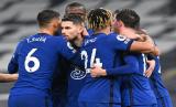 Gelandang Chelsea Jorginho (kedua kiri) merayakan golnya ke gawang Tottenham Hotspur bersama rekan-rekannya. (FOTO : EPA-EFE/Neil Hall)