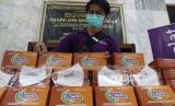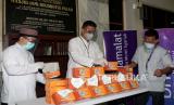Karyawan bank muamalat menata paket makanan dan masker ketika seremoni penyerahan simbolis bantuan di Masjid Jami Raudhotul Falah, Setiabudi, Jakarta, Jumat (5/2). PT Bank Muamalat Indonesia Tbk berkolaborasi dengan Laznas Baitulmaal Muamalat (BMM) menyalurkan bantuan sosial kepada masyarakat Indonesia yang terdampak pandemi Covid-19 dan korban bencana alam melalui Program Jumat Berkah. (FOTO : Prayogi/Republika.)