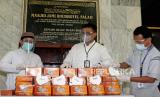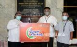 (dari Kiri) Ketua Yayasan Masjid Raudhotul Falah Ust. Ahmad Sofwan, Head of Distribution & Network Bank Muamalat Agung Prambudi dan Kadiv Pendistribusian & Pendayagunaan Baitulmaal Muamalat Jahidin saat seremoni penyerahan simbolis bantuan di Masjid Jami Raudhotul Falah, Setiabudi, Jakarta, Jumat (5/2). PT Bank Muamalat Indonesia Tbk berkolaborasi dengan Laznas Baitulmaal Muamalat (BMM) menyalurkan bantuan sosial kepada masyarakat Indonesia yang terdampak pandemi Covid-19 dan korban bencana alam melalui Program Jumat Berkah. (FOTO : Prayogi/Republika.)