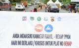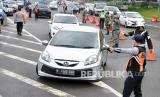 REPUBLIKA.CO.ID, BOGOR -- Petugas gabungan dari Dishub Kota Bogor, Satpol PP Kota Bogor, Polisi Militer dan Polresta Bogor Kota mengarahkan kendaraan roda empat berplat ganjil untuk memutar balik saat pemberlakuan aturan ganjil-genap di pos sekat Gerbang Tol Bogor, Tanah Baru, Kota Bogor, Jawa Barat, Sabtu (6/2).